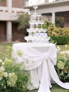 A stunning champagne tower during cocktail hour with an elegant bow in Fayetteville, Arkansas.