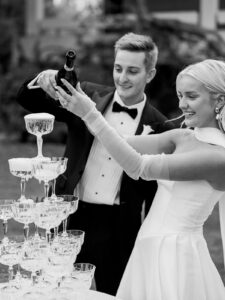A stunning champagne tower during cocktail hour with an elegant bow in Fayetteville, Arkansas.