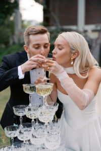 A stunning champagne tower during cocktail hour with an elegant bow in Fayetteville, Arkansas.